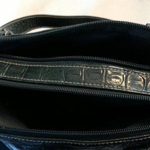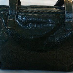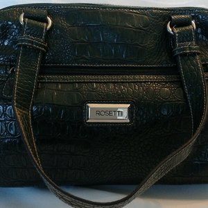 Rosetti dark green shoulder purse. 2 handles; front zippered pocket and 2 large zippered pockets, 1 of which has an interior zippered pocket. Made in Cambodia. RN# 108833. 100% polyvinylchloride. Approximate measurements: 14" wide, 8.5" tall, laid flat; 4" bottom. Like new condition.