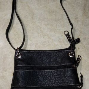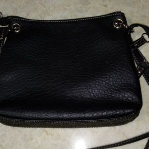 Very nice black hand bag by Rosetti, 2 side zipper pouches, w/ heavy pull tabs, adjustable shoulder strap, 54" from where strap is connected on one side to other side fully extended. 29" short adjustment. 2 inner pouches and small inner zip pouch. This bag is like new and very cool looking.