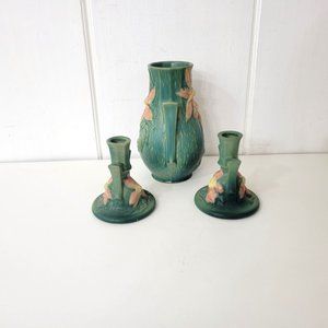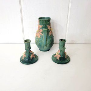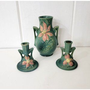 Roseville Clematis Pottery Candleholders and Vase
