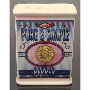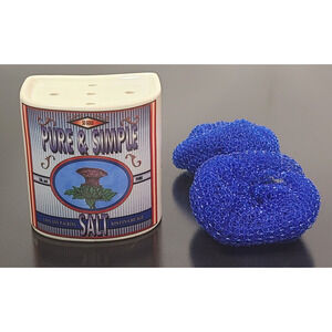 Roshco Pure & Simple Porcelain Salt & Pepper Shakers With Bonus Porcelain Scrubbing Pad holder that looks like a "Salt" carton / round box. Good Pre-owned Condition.