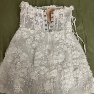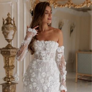 Isabelle is the epitome of timeless elegance. Crafted from exquisite lace, adorned with intricately embroidered 3D flower lace that glistens with delicate beading. This A-line, mini dress is designed with precision, featuring a boned structure for a flattering and fitted silhouette. As part of our limited edition couture line, Isabelle offers brides a one-of-a-kind gown to define their special day.