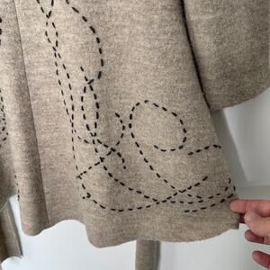 Anthropologie Rosie Neira 100% Wool Tie Front Knit Jacket Cardigan. Long sleeve, long cardigan. Dark brown stitching detail.