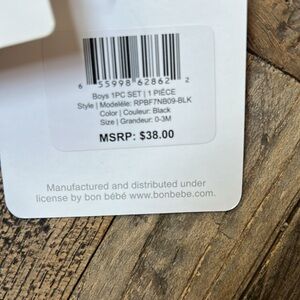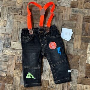 Rosie Pope Baby Boy Black Jeans with Suspenders NWT. Applique patches on front(Team, Lightening Bolt & Nerd Alert). Suspenders are in neon orange and can be removed. Pullon with snap at elastic waist. Size 0-3 months