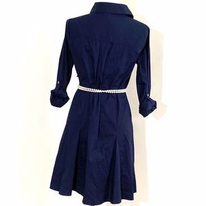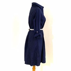 Elegant navy midi dress. Features button-down front. Includes a stylish belt.