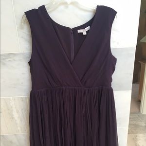 Loved this Rosie pope dress for my dressier occasions while pregnant. I actually also wore it for my baby shower. It's a baby doll style dress. Fitted around the chest and is loose and flowy over the baby bump. Hits a few inches above the knee. I'm 5'6" It is a chiffon material and a purple plum color.