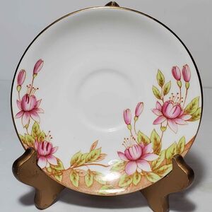 Vintage Rosina teacup and saucer. Bone china made in England. Pink flowers. Some spots under the glaze, and flaw on cup. See pictures.