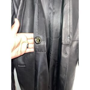 This Rosleen women's full-length trench coat is crafted from genuine leather and comes in a sophisticated large size. The coat is in mint pre-loved condition with no tears, rips, or stains, ensuring a like-new appearance. Its timeless design features a classic trench silhouette with a tailored fit, making it a versatile addition to any wardrobe. Ideal for both casual and formal occasions, this coat combines style and durability. Don't miss the opportunity to own a high-quality leather trench coat at a great price.