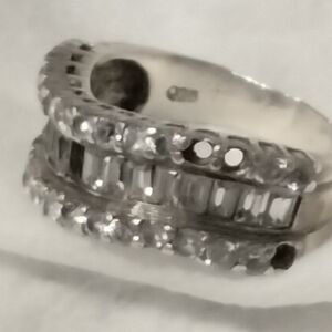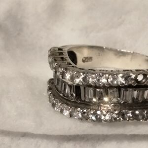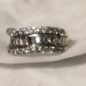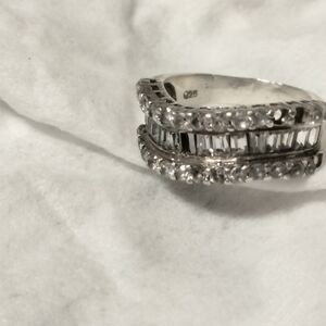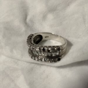 925 rhodium plated diamond ring. 3 round cut and a single baguette diamond is missing , hence the price asked(please see photos)