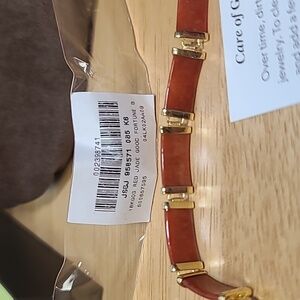 RED JADE AND 18KT GOLD OVER STERLING — Red jade "good fortune" bracelet in 18kt gold over sterling. 16x8mm rectangular red jade cabochons. Polished finish. 7 1/2 in. long. 3/8 in. wide. Double-latch safety. Box clasp.