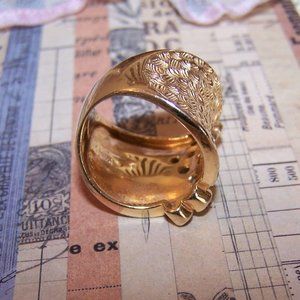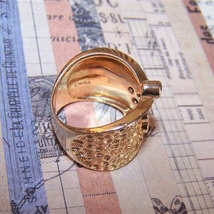 Bearing the hallmark for a Ross Simons manufacture, may I offer this Sterling Silver (hallmarked 925 China as pictured) yellow gold vermeil fashion ring that is quite the statement piece. A wide band, the front design is very modernistic with a trail of faceted round green chrysoprase and clear crystals at the center. Width at the front is 13/16" north/south - at the back 5/16" north/south. Weight is 9 grams. Now yes, I know the ring is made in China but for a short time, Ross Simons was using a really good maker for their jewelry - I believe this ring is from that jeweler. No problems I can spot, yellow gold overlay is thick, design is terrific and ring size is 6.75.