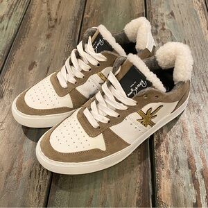 Ross & Snow Sneakers, Italian Leather Women’s Skate Shoes, Size 7.5, Sherpa Padded. White, Beige & Gold. Preowned. Nice condition with only a tiny bit of scuffing from storage. Does not include original box.