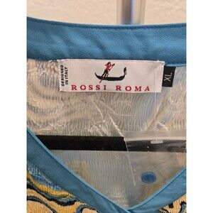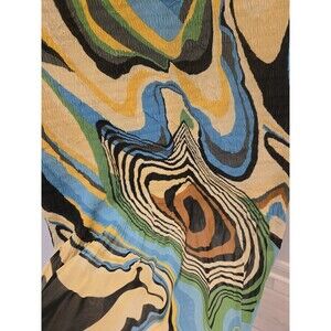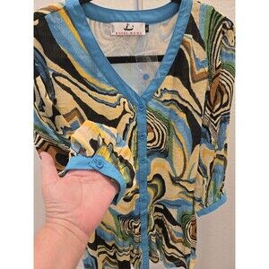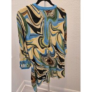 This vibrant, highly textured tunic top from the brand ROSSI ROMA is a Abstract Print Crinkle Tunic Blouse with contrast piping. This vibrant Multicolor Abstract Swirl Print (reminiscent of Psychedelic or Mod Print art) in Blue, Yellow, Black, and Tan features a Bright Aqua/Turquoise contrast piping along the V-neckline, button placket, and cuffs and is made in Italy.