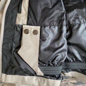 Pit zips, attached glass cleaner in chest pocket, lots of inside pockets , one for headphones & goggles