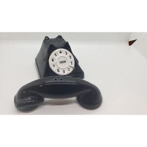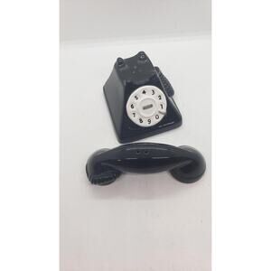 This set includes two ceramic shakers styled as a classic rotary telephone—one piece for salt, one for pepper. Both have original stoppers and molded details, including the handset cord, dials, and rotary design.