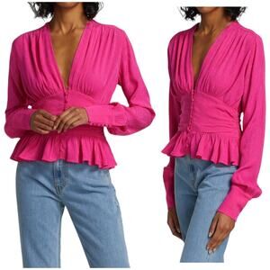 Rotate Birger Christensen NWT Tracy Peplum Top Size 4 Barbie Pink Ruched V-Neck