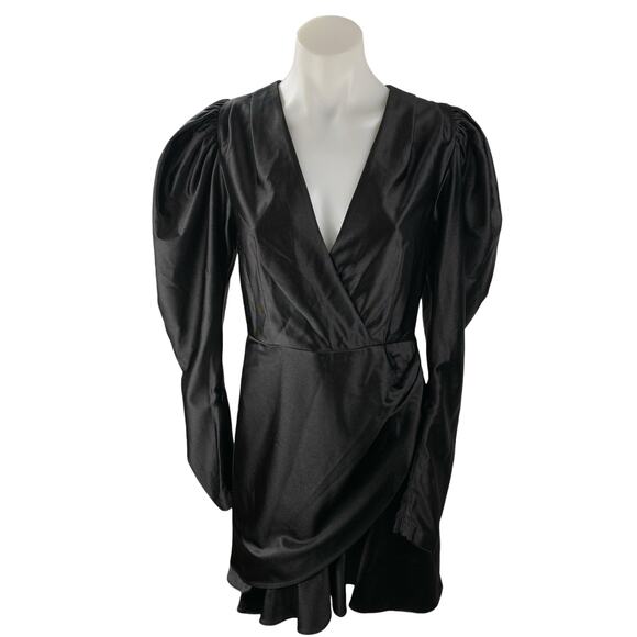 Rotate Black Silky Satin V-Neck Long Puff Sleeve Mini A-Line Wrap Dress Size 4