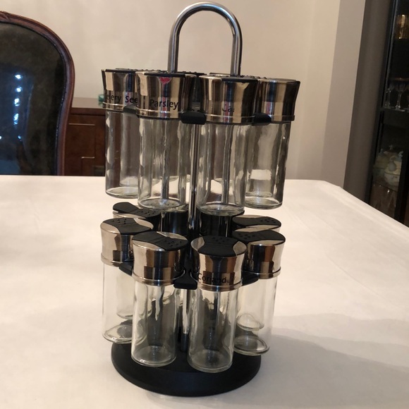 Organize your kitchen with this sleek rotating spice rack featuring glass jars and a black base. Perfect for keeping your spices fresh and accessible.