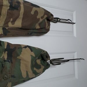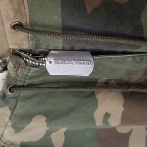 Army camo cargo pants with 7 pockets, button zipper close, tie bottom, and ultra force dog tag