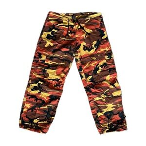 Rothco camouflage drawstring cargo low rise pants. Colors are orange, yellow, brown, and black. I am a size M and I wear a size 6 pants and these fit me well.