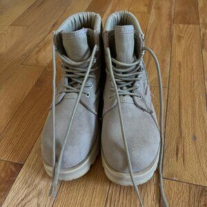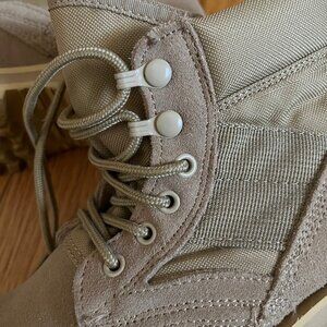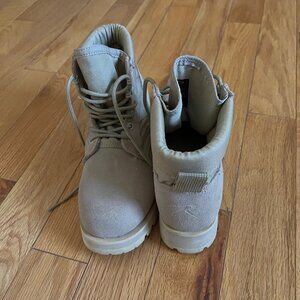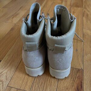 Rothco combat boots with durable tan suede leather upper. Thick sole for improved stability and traction and midsole heat barrier. Padded collar with pull tab. Measures 6" in height and nylon coated brass speed hook/eyelet lacing system. Only wore once or twice, sole is slightly soiled. Otherwise in great condition. Brand size: men's 5, shoe length 10" and foot width 3.6". Color: Desert tan