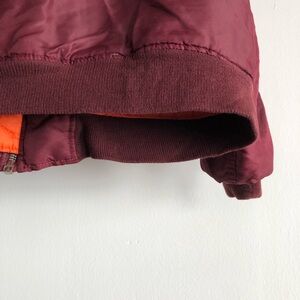 This maroon/burgundy Rothco MA-1 bomber has an orange interior and the inner filling has been partially removed to make it a less chunky fit, and it’s been slightly stonewashed, you’ll notice it on the snaps for the pockets as the coating has chipped off a little to give appearance of it being worn. It’s still very sturdy material , just less sheeny, with some well hit areas from the stonewash, the bindings are looser too. This has not been worn, it’s actually new and was part of a test for further development, so it’s like a used blank for whatever you’d like to add to it.