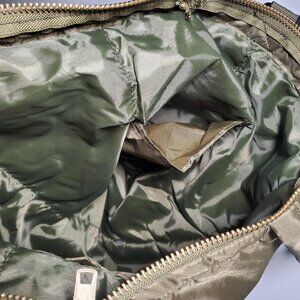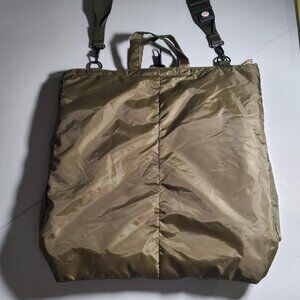 bag is large (18.5 by 19 inches) and lightweight (13ozs) and has handles and an optional crossbody strap - one side has 2 pockets that velcro and snap shut - heavy top zipper and one inside pocket - in excellent condition - made in China - see all pics for measurements