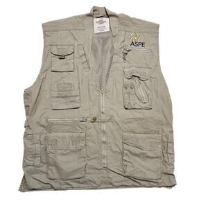 Sleeveless khaki colored vest with multiple cargo style pockets. Zipper closure, mesh interior lining. Embroidered ASPE on the front.