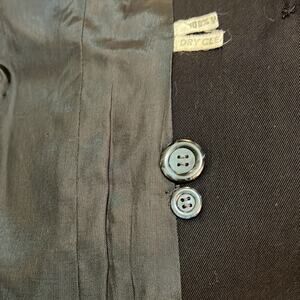 Long Sleeve Fully Lined Black Wool Blazer. Made in Romania. Distinctive Detailed Stitching. No Size Label. Follow Measurements. Pit to Pit 19.5" and Length 21". Item 475