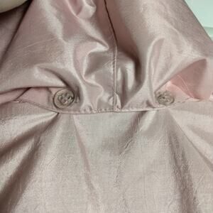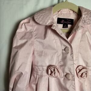 Rothschild girls dressy spring jacket. Detachable hood and tailored fit with rosettes at the waist. Covered buttons and puff sleeves, so cute! Very good condition except for a few dark marks on the shoulders. They're pretty subtle in real life. Color is 'tickled pink'. 100% polyester, made to look like silk.