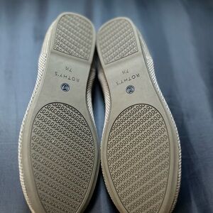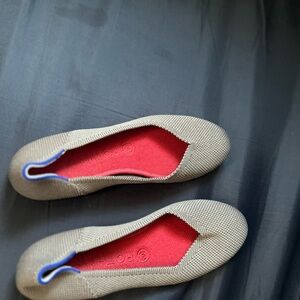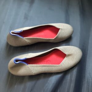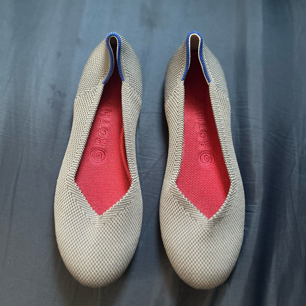 Chic gray flats with vibrant red interior. Comfortable and stylish for everyday wear.