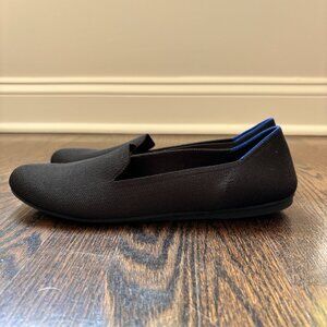 Knit upper in black, with a Venetian vamp and rounded toe box. No break-in period.