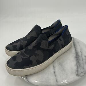 Stylish slip-on sneakers with a black camo pattern. Blue accents add a pop of color. Comfortable and versatile.