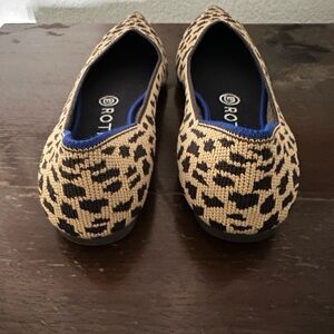 These Rothy's loafers showcase a chic black and cream polka dot (leapord) design, blending playful style with timeless elegance. The classic flat silhouette and pointed toe offer a sophisticated look, perfect for any occasion. Crafted for comfort and versatility, these shoes are a stylish addition to any wardrobe.