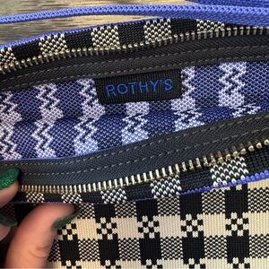 Stylish checkered wristlet by Rothy's. Features a black and white pattern. Blue wrist strap for easy carrying.