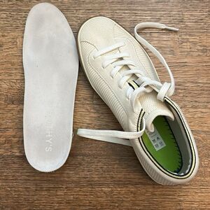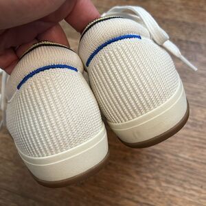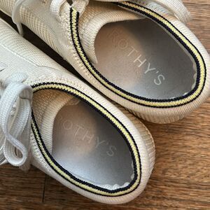 Stylish cream athletic shoes by Rothy's. Comfortable and versatile. Perfect for everyday wear.