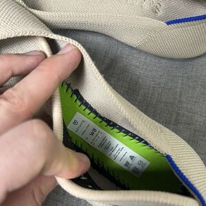 Step out in style with Rothy's cream/pale tan flats featuring a chic blue trim. Perfect for any occasion, these flats offer both comfort and elegance.