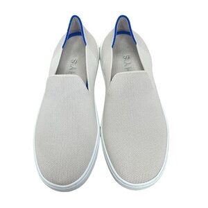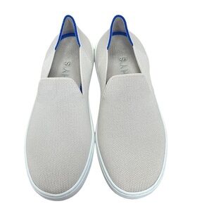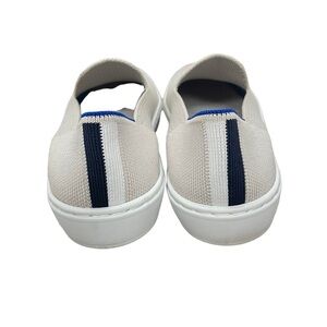 Stylish slip-on sneakers. Cream upper with blue accents. Comfortable and versatile.