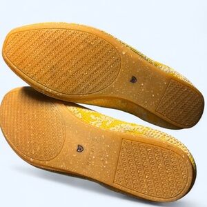 Step into sustainable style with Rothy's vibrant yellow flats, showcasing a unique geometric pattern. These slip-on shoes are crafted for comfort with a rounded toe and elastic trim, making them perfect for daily wear. Enjoy the blend of casual elegance and eco-friendly design in every step.