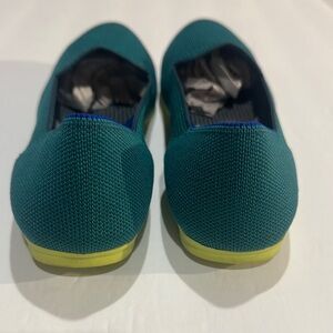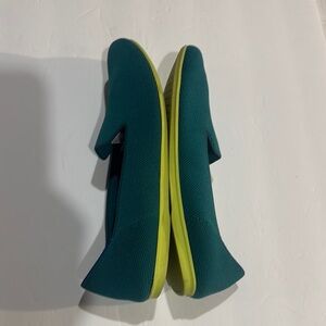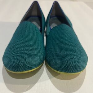 Rothy's Deep Teal jade Knit Flat loafers rounded toe w yellow bright bottom 8.5