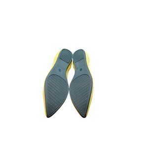 These Rothy's flats are a women's size 7.5 in a vibrant marigold yellow color with a pointed toe design. They are slip-on style flats made from recycled knit fabric with contrast trim at the heel. The shoes feature a cushioned insole, lightweight construction, and breathable design, making them suitable for travel, casual outings, workwear, or business settings. This retired classic ballet style is a comfortable and sustainable choice for various occasions throughout the year.