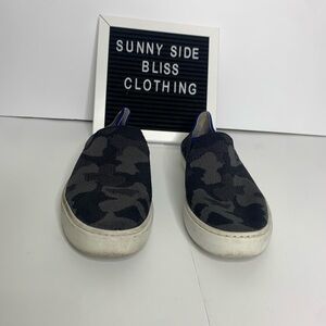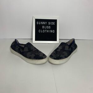 These are multi colored camouflage slip on platform shoes. They have been worn a few time but are in great preowned condition. No flaws. In a size 7.5