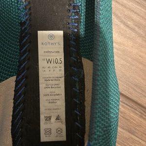 Experience the perfect blend of style and comfort with Rothy's green flats, featuring a vibrant yellow stripe along the sole. These slip-on shoes boast a minimalist design with a rounded toe, making them ideal for both casual and business casual settings.
