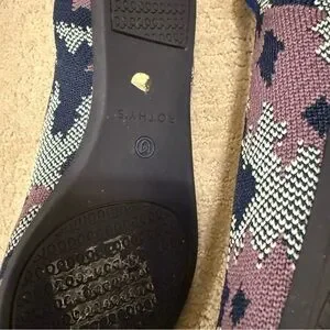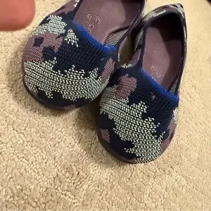 outfit. It is a camouflage style print in shades of purple. Back features bright blue trim. Pointed toe flat. Made of recycled material.