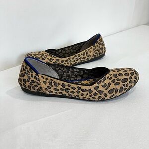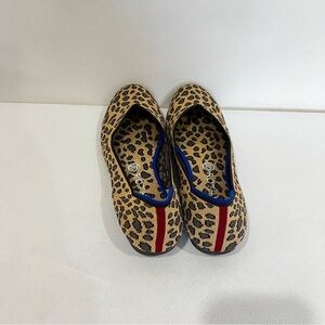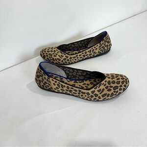 Excellent condition, Rothy's Round Toe Cheetah Animal Print Flat Shoe Size 10 Tan/Gray/Chocolate/Blue Detail.
