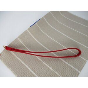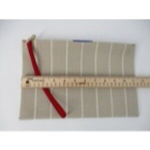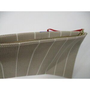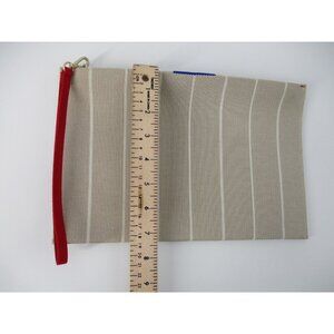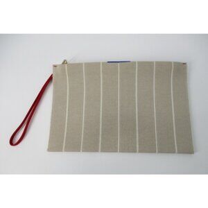 Stylish tan clutch with white stripes. Features a red wrist strap. Perfect for any occasion.