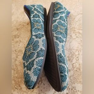 Chic Rothy's flats with a teal and navy design. Eco-friendly and comfortable.