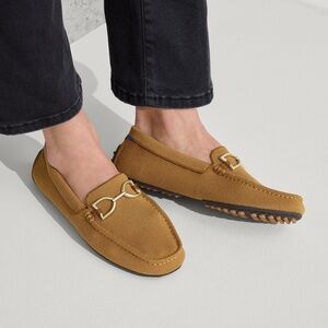 Soft, flexible upper in camel brown with a gold hardware signet bit on the vamp.