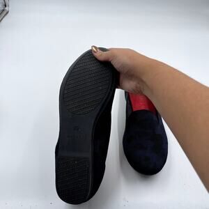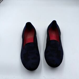 A stylish and comfortable pair of Rothy's "The Loafer" in the popular, retired Navy Blue Camouflage pattern. These slip-on flats are made with Rothy's signature sustainable knit, spun from recycled plastic water bottles. They feature a classic rounded toe, a flexible upper, and a cushioned, contoured insole for all-day comfort. Perfect for work, travel, or casual wear, and they are fully machine washable for easy care.