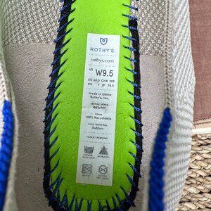 EUC Size 9 1/2 Tan and Cream weave A classic shoe with exceptional comfort, timeless design and washable style Kit from Rothy's signature thread (spun from plastic water bottles) Round toe Slip on Soft, flexible upper in a Tan and Cream weave Signature Blue halo at heels Tan and Cream stripes at heels Comfortable, Brown weave insoles with Pink contrast stitching Durable, rubber non-slip outsoles in Tan Machine washable Light discoloration on outsoles and outsole edges -- see pics 13 & 14 Faint soiling of insoles and light fuzziness to heels -- see pic 11 Minimal heel wear -- see pic 15 Approx measurements: Interior length (toe to heel): 10" Interior bridge width: 3"