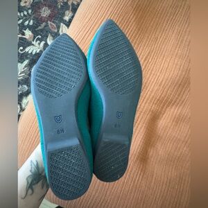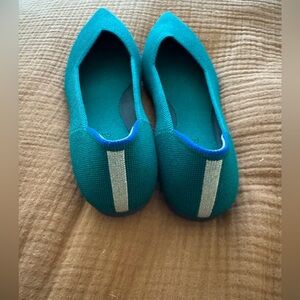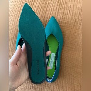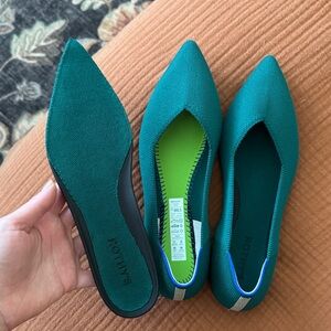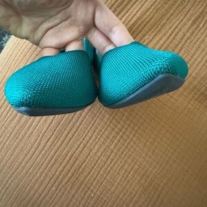 Rothy’s flats with gold trim at back. Color is Dark Emerald.